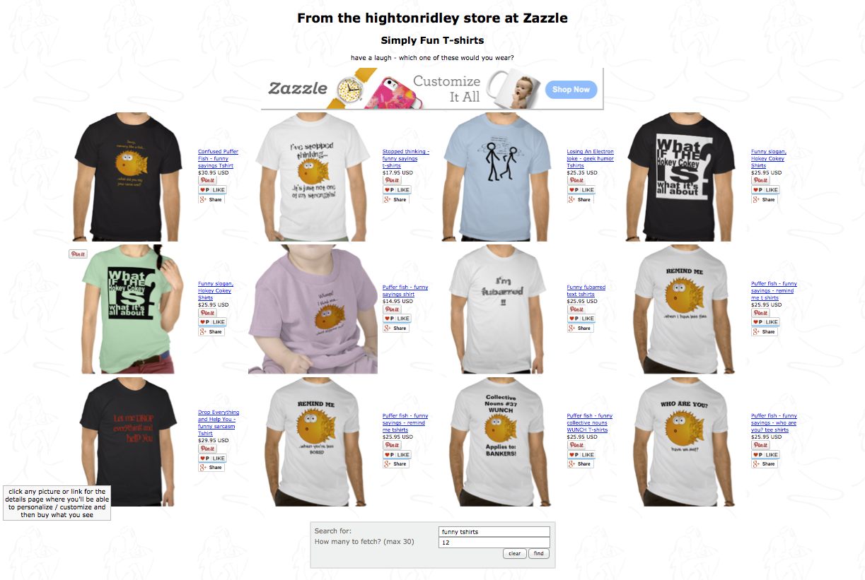 SeeMyBest lets you (you are a Zazzler aren't you?) show the best products from your store on web pages that are refreshed whenever someone visits. And it has a search box that allows visitors to search just in your store, too, showing the results right there on your page!